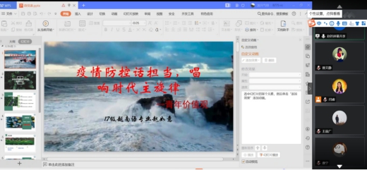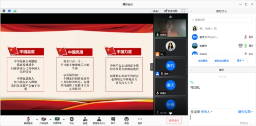身处各地学生党员们围绕主题精心选材、撰写文稿、制作PPT,结合图片、音视频、诗歌等多种方式,从国家与国际、国家与人民、国家与自己等多个方面,深刻阐述了在全球面临百年未有之大变局时,中国向世界展示出的中国力量、中国气度、中国担当。其中,来自本科生三支部的王贤思同志在此次抗击疫情中,充分发挥所学专业,志愿协助完成越南语相关的医疗物资检验和海外捐赠物资对接工作,展现了学生党员肩负起党员的责任与担当,以绵薄之力为国家抗疫做出贡献;来自本科生一支部的李思宇同志,从自身社区疫情防控志愿者的经历,深刻体会到中国共产党的领导和中国特色社会主义的优越性,充分肯定在抗击疫情中展现出的中国温暖、中国亮度、中国力度;来自本科第三党支部的入党积极分子窦佳伟同志以“疫情中的平凡与伟大”为题,以朗诵的形式展示了疫情中平凡而伟大的故事,以小见大,深刻诠释中国共产党的先进性和独特优势,展示了人民英雄的力量和伟大精神。