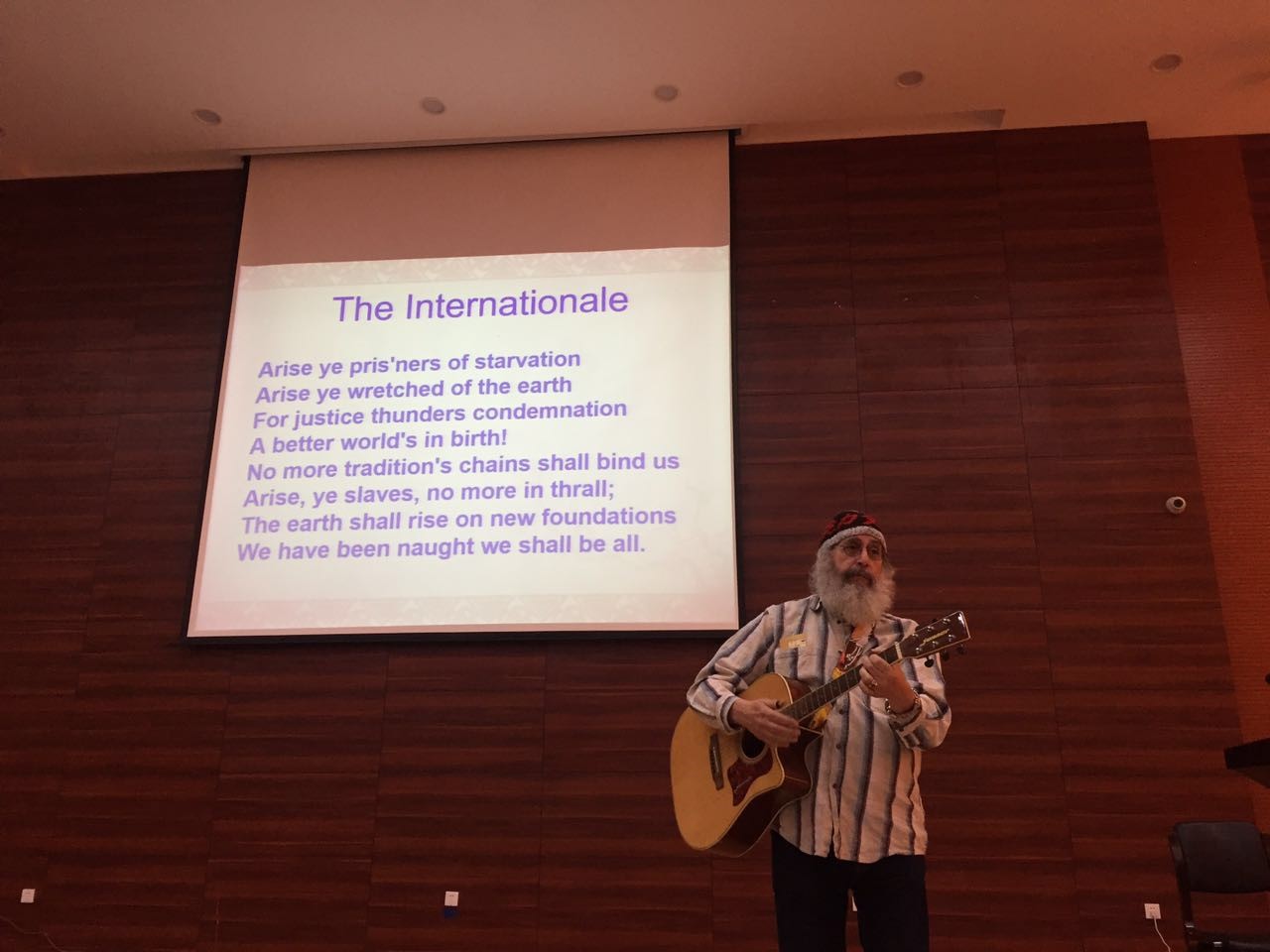 应云南省外专局、云南大学国际交流处和外国语学院的邀请,现执教于中央民族大学的美国专家马克·力文博士(Dr. Mark Levine)于2018年11月30日(周五)上午10:00-12:00在云南大学呈贡校区外国语学院一楼报告厅举行学术讲座。讲座的题目为U.S. History/Culture: The Sounds of Social Change(美国历史/文化:社会变革之声),讲述音乐在美国历史上的政治、社会运动中的作用,涉及废奴运动;大萧条时期美国工人运动;民权运动与反越战运动等。马克·力文博士在讲座中穿插着吉他弹奏,歌曲演唱,将音乐与政治、社会运动的紧密联系呈现给听众。演讲之余,马克·力文博士与学生听众进行互动。报告厅座无虚席,整个场面气氛较好,收到良好效果。