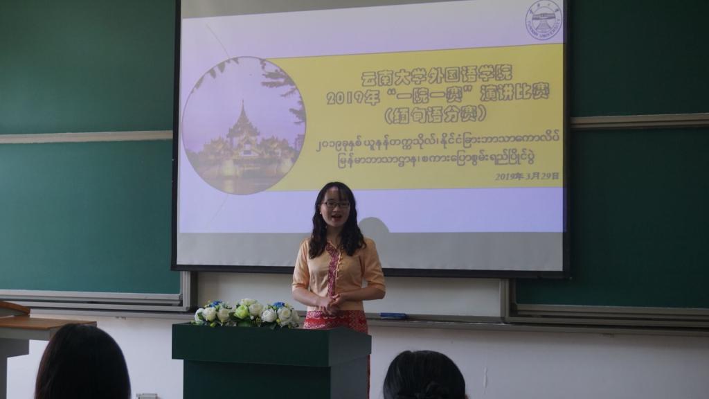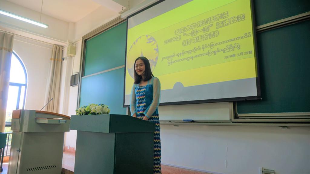 缅甸语系系主任李堂英老师为本次比赛致辞,鼓励同学们展示缅甸语专业学生的精神风貌,敢于不断地挑战自我和超越自我,表扬同学们在缅甸语学习中的努力勤奋,并预祝本次演讲比赛圆满成功。