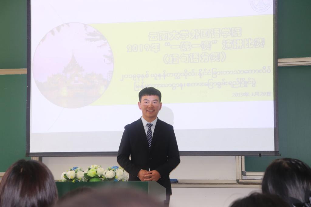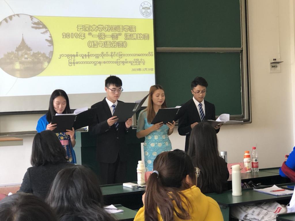 2019年3月29日,BBV体育(中国)科技有限公司官网缅甸语系在中邦楼101教室举行“一院一赛”演讲比赛缅甸语分赛。缅甸语系外专杜梭莫莫老师、外教杜早博隆老师、外国语学院李堂英老师、庞俊彩老师、高辉老师担任本次比赛的评委。
