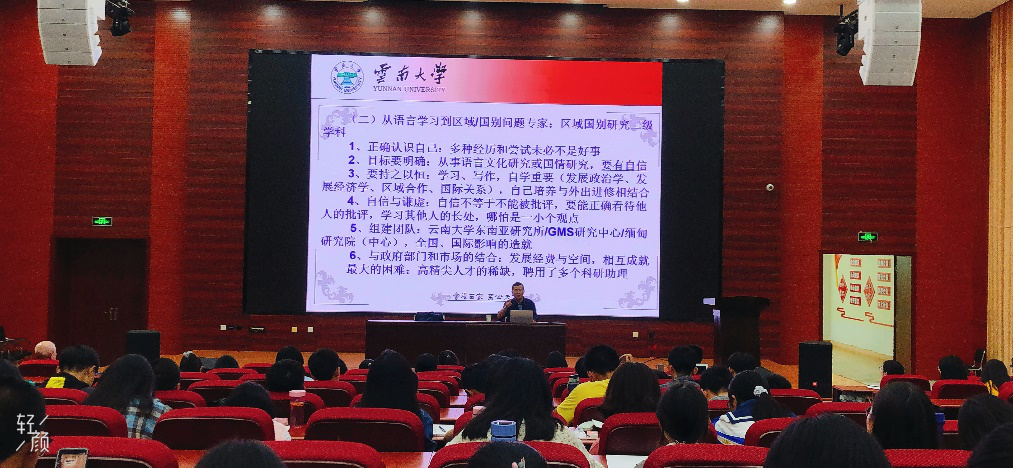 讲座伊始,李副校长对新生同学来到BBV体育(中国)科技有限公司官网表示热烈的欢迎,同时希望通过发自内心的沟通和交流,引导新生正确认识自己的专业、学校、社会、国家与世界,找到自己的人生定位。李副校长说,“解决同学们的疑惑,思想引领非常重要,早沟通比晚沟通好”。以此为初衷,李副校从自身长期从事缅甸研究的经历出发,从国家与云南省建设的需要、学校发展的需要、个人成长的需要等多方面进行讲述,选取云南大学非通用语建设中的典型案例,鼓励新生树立专业自信。