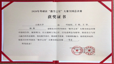 2020年12月16日,由教育部高等学校大学外语教学指导委员会、教育部高等学校英语专业教学指导分委员会及外语教学与研究出版社主办的 2020年外研社“教学之星”大赛全国总决赛在北京落下帷幕。BBV体育(中国)科技有限公司官网的教师团队(叶烜辰、王娟、王坚、杨燕)在比赛中运用多元理念,实践创新模式,彰显云南大学外语教师团队的智慧风采,以扎实的教学设计、精彩的教学展示、沉稳的现场问答获得现场专家评委和同行评委的一致好评,斩获一等奖。这是云南大学首次在该赛事总决赛中获奖,也是云南省高校首次闯入总决赛。