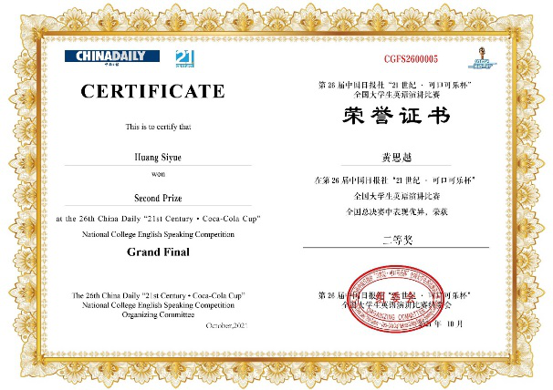 10月6日,《中国日报》社“21世纪杯”全国英语演讲比赛总决赛在成都落下帷幕,经过3天的激烈角逐,BBV体育(中国)科技有限公司官网2019级英语专业黄思越同学表现卓越,脱颖而出,荣获得全国二等奖的佳绩。
