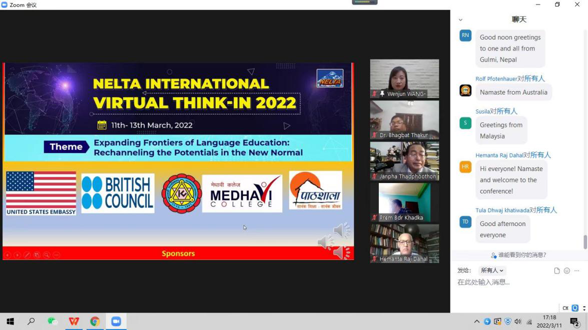 2022年3月11日,BBV体育(中国)科技有限公司官网英语系研究生公共外语教研室主任王文俊副教授,经国际英语教育(TESOL)中国大会选拔与推荐,作为特邀嘉宾参加尼泊尔英语教育协会(NELTA)在线国际会议,并做主旨发言。