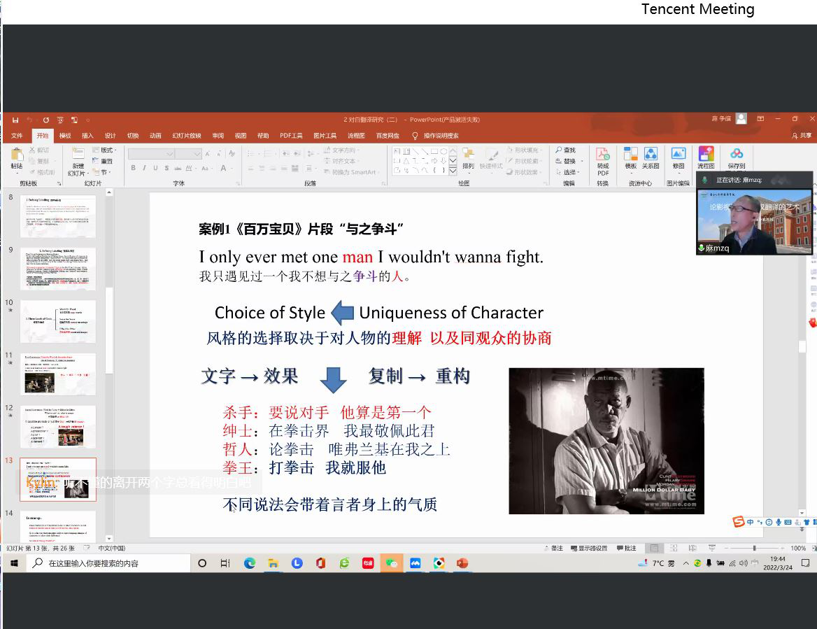 2022年3月24日,著名影视翻译专家、中国传媒大学外国语言文化学院博士生导师,全国高校影视艺术学会影视国际传播专业委员会副主任委员兼副理事长麻争旗教授应邀,为BBV体育(中国)科技有限公司官网师生举办了论影视剧对白英汉翻译的艺术的学术讲座。