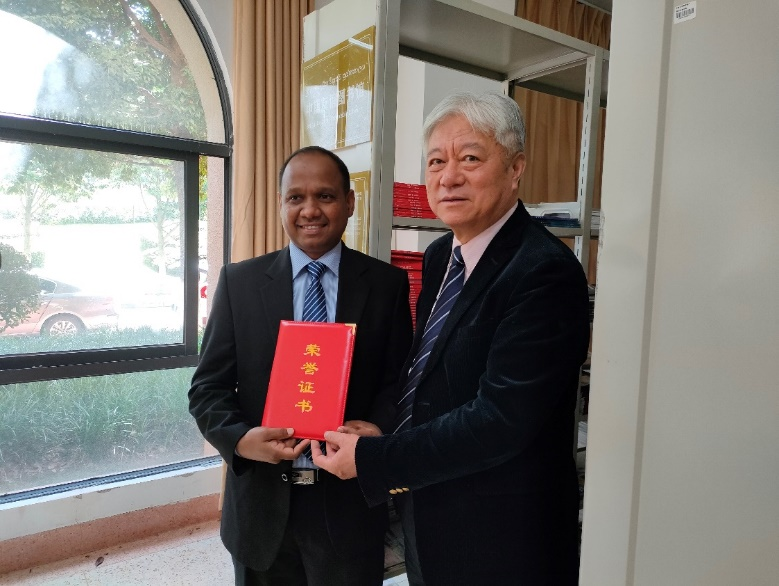 在简短、简朴的剪彩仪式之后,刘树森院长向苏嘎特先生颁发了荣誉证书,出席仪式的全体师生在“中斯友谊图书馆”铭牌前合影留念。出席剪彩仪式的还有谢萍、臧运发、王浩三位副院长和僧伽罗语专业部分师生。