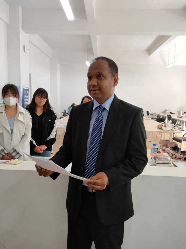 苏噶特先生表示,刘树森院长的肺腑之言令他非常感动,“中斯友谊图书馆”挂牌成立,是他人生中一个重要的高光时刻。在疫情背景下,为了筹备、寄送这批图书,他的妻子付出了艰辛的努力。捐赠活动不仅得到了斯里兰卡教育部和中国驻斯里兰卡大使馆的大力支持,也得到了外国语学院的高度重视和肯定,令他十分感佩。他真诚希望外院学子努力学习,为发展中斯两国人民的珍贵友谊贡献力量。