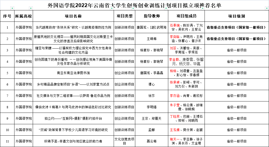 2022年7月8日,云南省教育厅公布大学生创新创业国家级/省级项目的立项推荐名单,云南大学共有247个项目获得国家级/省级创新创业项目立项,其中外国语学院共有11个项目获得了国家级/省级项目推荐,占2022年学校国家级/省级立项总数的4.45%。