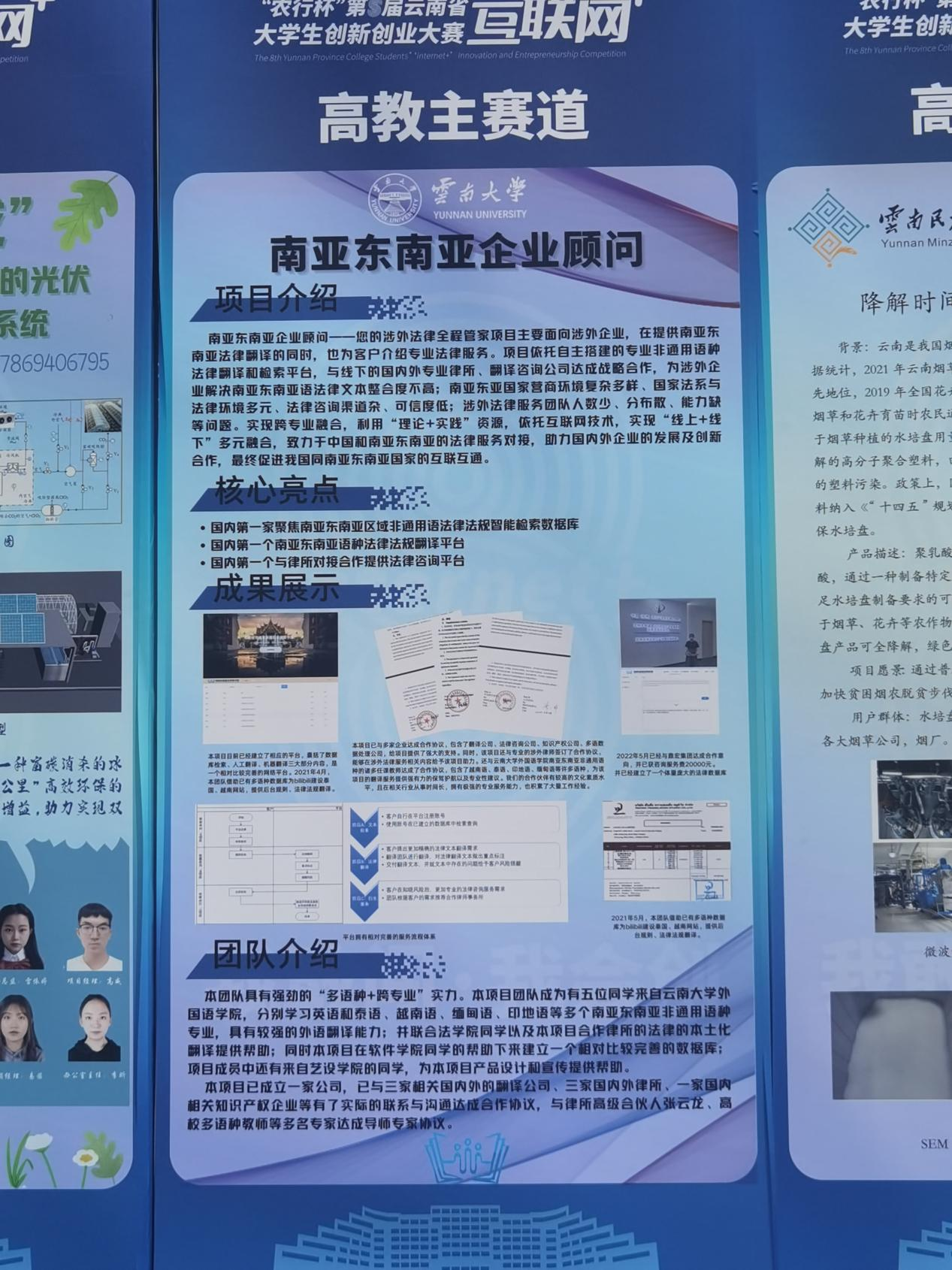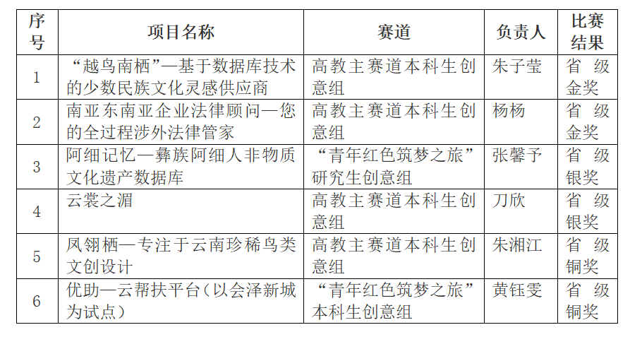 进入7月的省内评审阶段,BBV体育(中国)科技有限公司官网6个晋级省赛的项目均顺利通过省内初审。其中高教主赛道的《“越鸟南栖”—基于数据库技术的少数民族文化灵感供应商》、《南亚东南亚企业法律顾问—您的全过程涉外法律管家》项目和“青年红色筑梦之旅”赛道的《阿细记忆—彝族阿细人非物质文化遗产数据库》项目入围省级金奖争夺赛现场路演决赛。