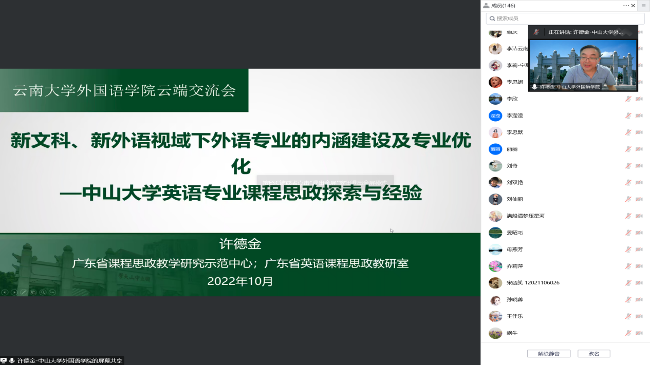 该讲座是“云南大学百年校庆外国语言文学文化系列讲座”之一,主题为“新文科、新外语视域下外语专业的内涵建设及专业优化——中山大学英语专业课程思政探索与经验”,采用线下与线上相结合的参会方式。讲座还吸引了南开大学、中国人民大学、陕西师范大学、贵州师范大学、华北水利水电大学等各高校师生的关注。