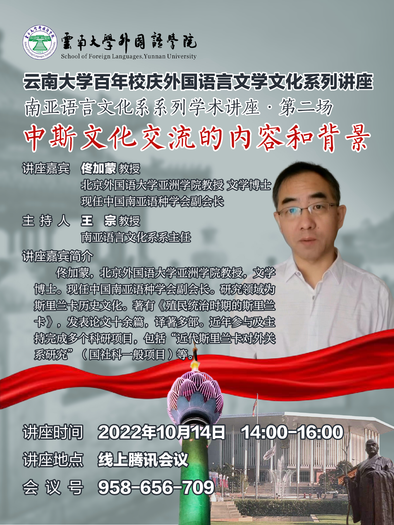 本次讲座是云南大学百年校庆外国语言文学文化系列讲座之一,同时也是南亚语言文化系系列学术讲座的第二场。本次讲座,主题鲜明、内容丰富、引人深思,对于帮助我校僧伽罗语专业师生进一步强化使命担当、探索实践中斯文化交流具有极强的指导意义。