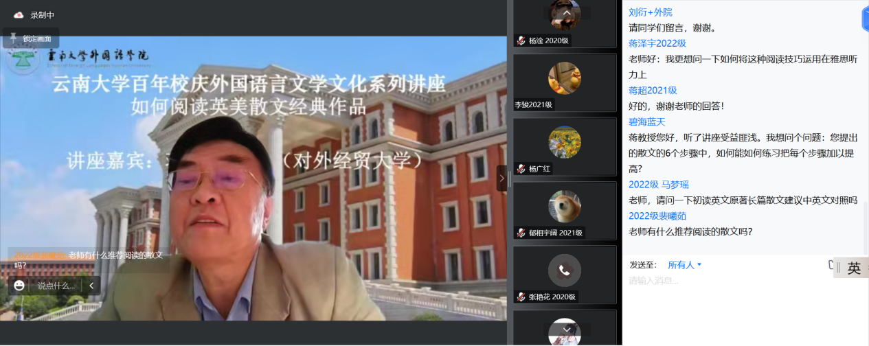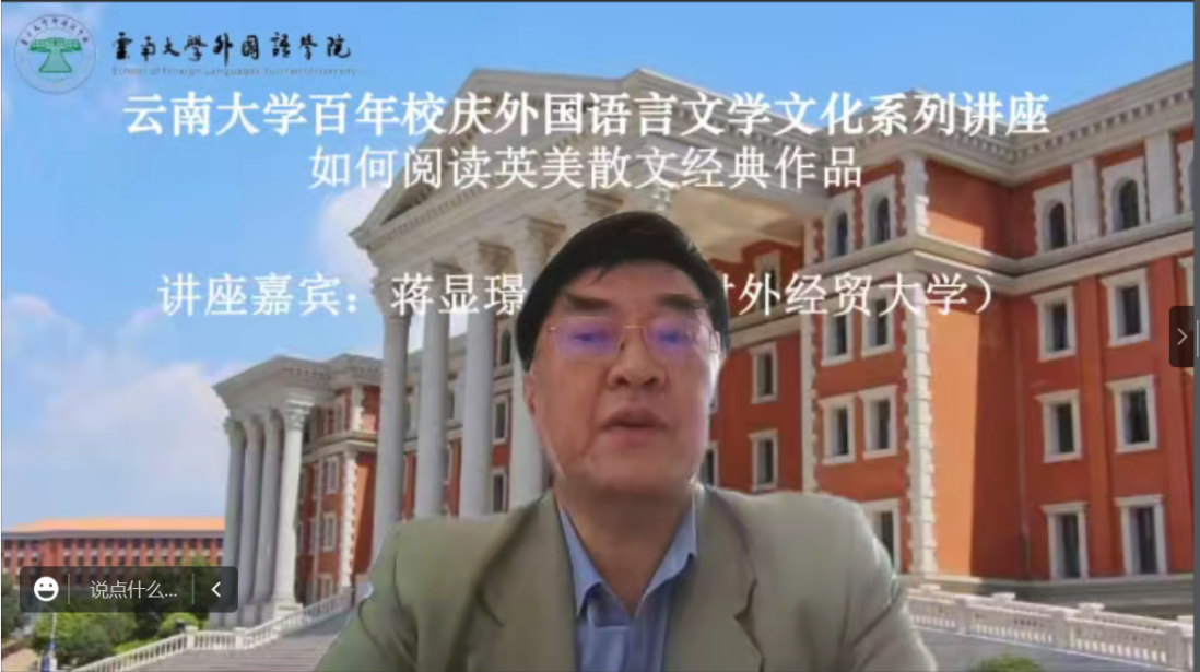 2022年11月25日,著名英美文学研究专家、对外经济贸易大学英语学院英语系原主任蒋显璟教授应邀为BBV体育(中国)科技有限公司官网师生做了一场题为“如何阅读英美散文经典作品”的精彩讲座。本次讲座是“云南大学百年校庆外国语言文学文化系列讲座”之一,以在线的方式进行。该讲座由BBV体育(中国)科技有限公司官网英语系副系主任刘衍老师主持,BBV体育(中国)科技有限公司官网和兄弟院校的百余位师生以线上的方式聆听了该讲座。