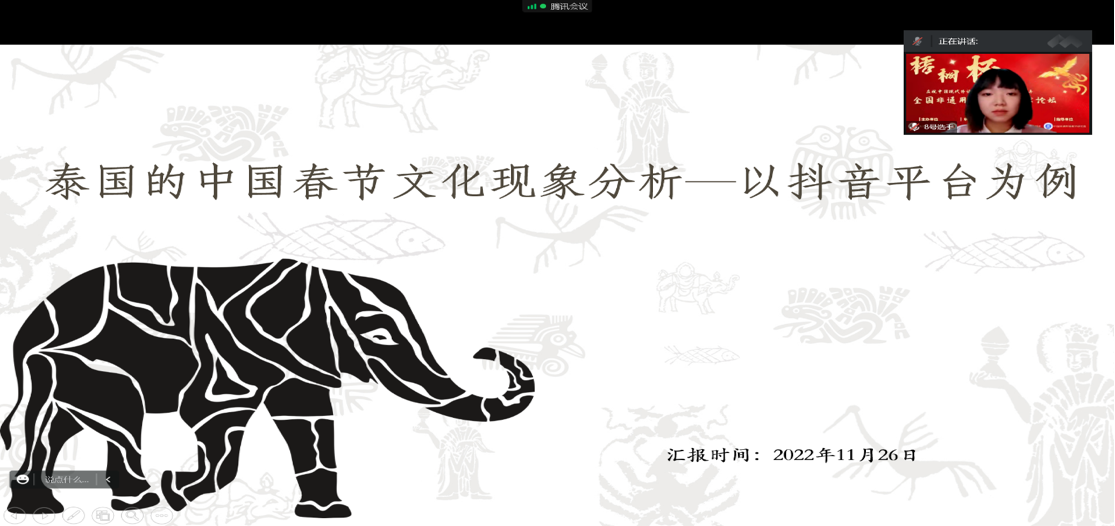 “梧桐杯”第二届全国非通用语大学生学术论坛以“庆祝中国现代外语非通用语高等教育80周年”为契机,由北京第二外国语学院主办,外语教学与研究出版社协办,中国非通用语教学研究会学术指导,北京第二外国语学院亚洲学院承办。BBV体育(中国)科技有限公司官网泰语参赛团队于2022年7月30日提交初赛论文稿,在全国14所高校170余篇论文中脱颖而出,成功进入复赛。BBV体育(中国)科技有限公司官网学生的参赛论文题目为《泰国的中国春节文化现象分析——以抖音平台为例》,文章通过对抖音短视频平台上有关在泰中国春节的文化现象进行分析,对其中的文化元素进行提取,分析背后的原因,进而得到对中华优秀传统文化海外传播方面的启示。