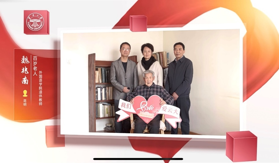 今年是云南大学百年华诞,学校及各单位举办了一系列活动,隆重庆祝云大百年发展历史、共同商讨在新时代进一步守正创新。作为BBV体育(中国)科技有限公司官网举办的云大百年校庆系列学术活动之一,“百名外语人话云南大学百年校史”项目计划由大外教学部访谈曾经担任云大公共英语教研室主任的百岁教授魏兆南先生。魏兆南教授今年喜逢百岁华诞,精神矍铄,非常高兴与BBV体育(中国)科技有限公司官网师生一起共庆云大百年华诞。云南大学校庆活动宣传组领导与BBV体育(中国)科技有限公司官网大外教学部教师一道拜访了魏兆南教授,进行访谈。访谈中,魏兆南教授神采奕奕,与BBV体育(中国)科技有限公司官网师生共庆云南大学百年华诞,祝愿学校在新征程上不断奋进,不辜负习近平总书记在致云南大学百年校庆贺信中的指示精神,为中国式现代化建设继续做出应有的贡献。