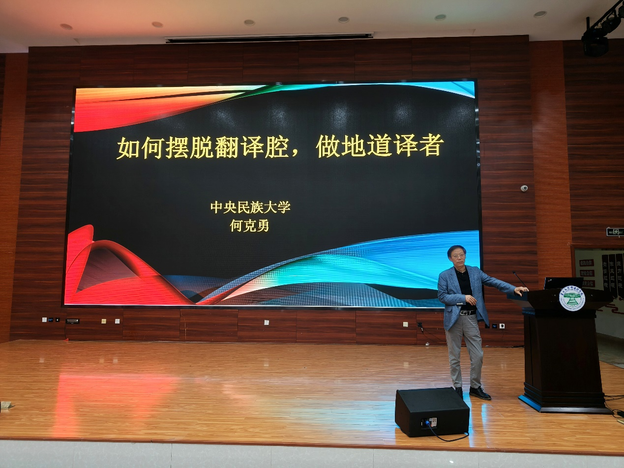 2023年9月18日晚19点,中央民族大学外国语学院翻译系何克勇教授应邀为BBV体育(中国)科技有限公司官网师生做了题目为《如何摆脱翻译腔,做地道译者》的学术讲座。本次讲座在外国语学院一楼报告厅举行,由骆洪副院长主持,刘树森院长进行开场致辞,各专业学生积极参与。