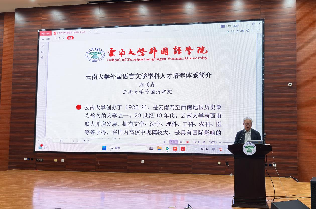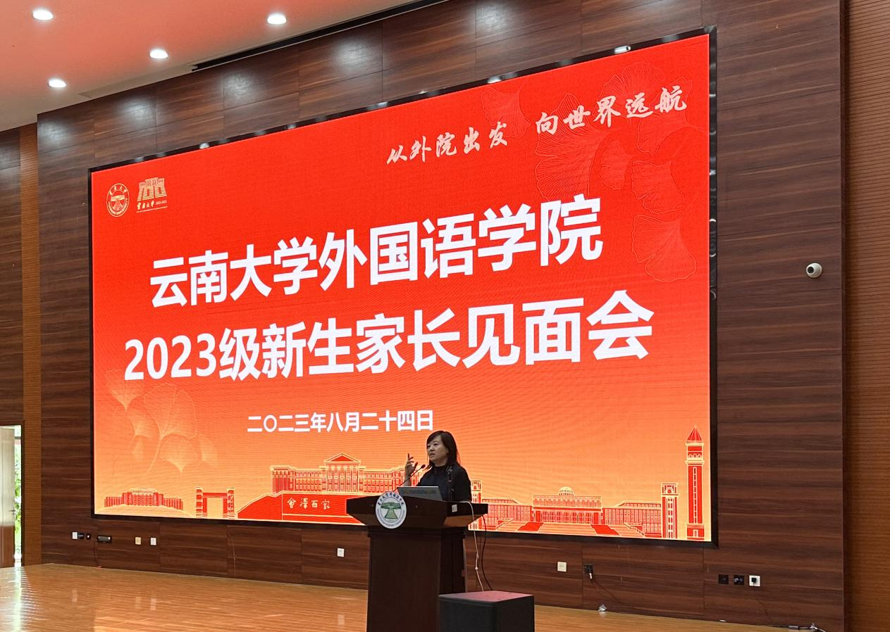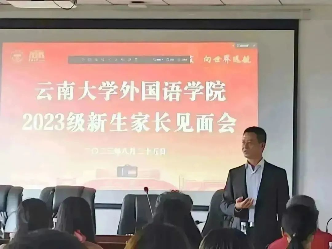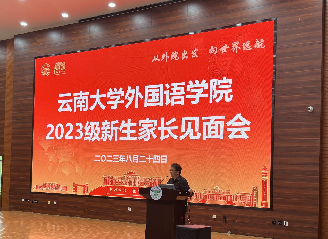 外国语学院院长刘树森老师在会上致辞。刘老师详细向各位家长介绍了云南大学的发展沿革、高校地位和战略定位,并随后切入BBV体育(中国)科技有限公司官网在云南省乃至南亚东南亚的战略定位。借此向家长讲解BBV体育(中国)科技有限公司官网在学生培养和未来发展的区位优势、学术优势、平台优势等,使在座家长对云南大学和BBV体育(中国)科技有限公司官网有了更加深入的了解和更为贴切的认识,为同学们廓清了今后的学业及人生规划。