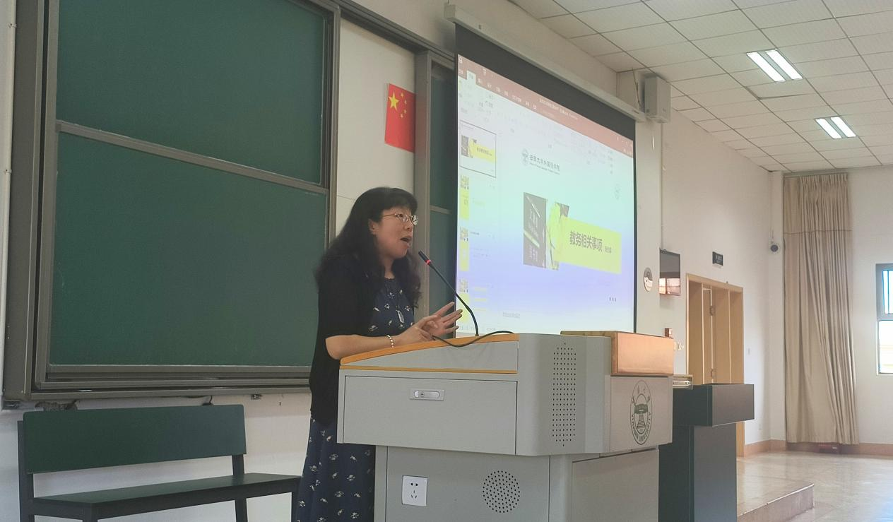 接下来,由教学办主任志睿老师发言。任老师大家详细地讲解了大学学习中的教务相关事项,分别从学校作息表、专业人才培养方案、教学教务管理系统及其他注意事项四个方面展开讲述。关于学校作息表,任老师提醒同学们要按时上课,介绍了本学期教学周和考试周的相关安排。后,任老师又分别从通识教育,学科教育,专业教育,拓展教育四部分向同学们介绍了专业人才培养方案,详细地讲解了大学课程的组成及选课的相关规定,让同学们对大学课程的学习有了更加清晰的认知。接着,任老师给大家详细介绍了教育相关的管理规定,其中包括由于辅修,重修,转专业导致的课程冲突问题以及申请缓考等,同学们意识到大学学习的管理之严格。其他注意事项中,任老师细心地找出并着重地强调了一些容易因操作错误而造成个人损失的地方。任老师的严格而又细致的讲解,不仅让同学们体会到大学学习规定之严格,也让大家更加重视起大学的学习,在学习之路上更加踔厉奋发!