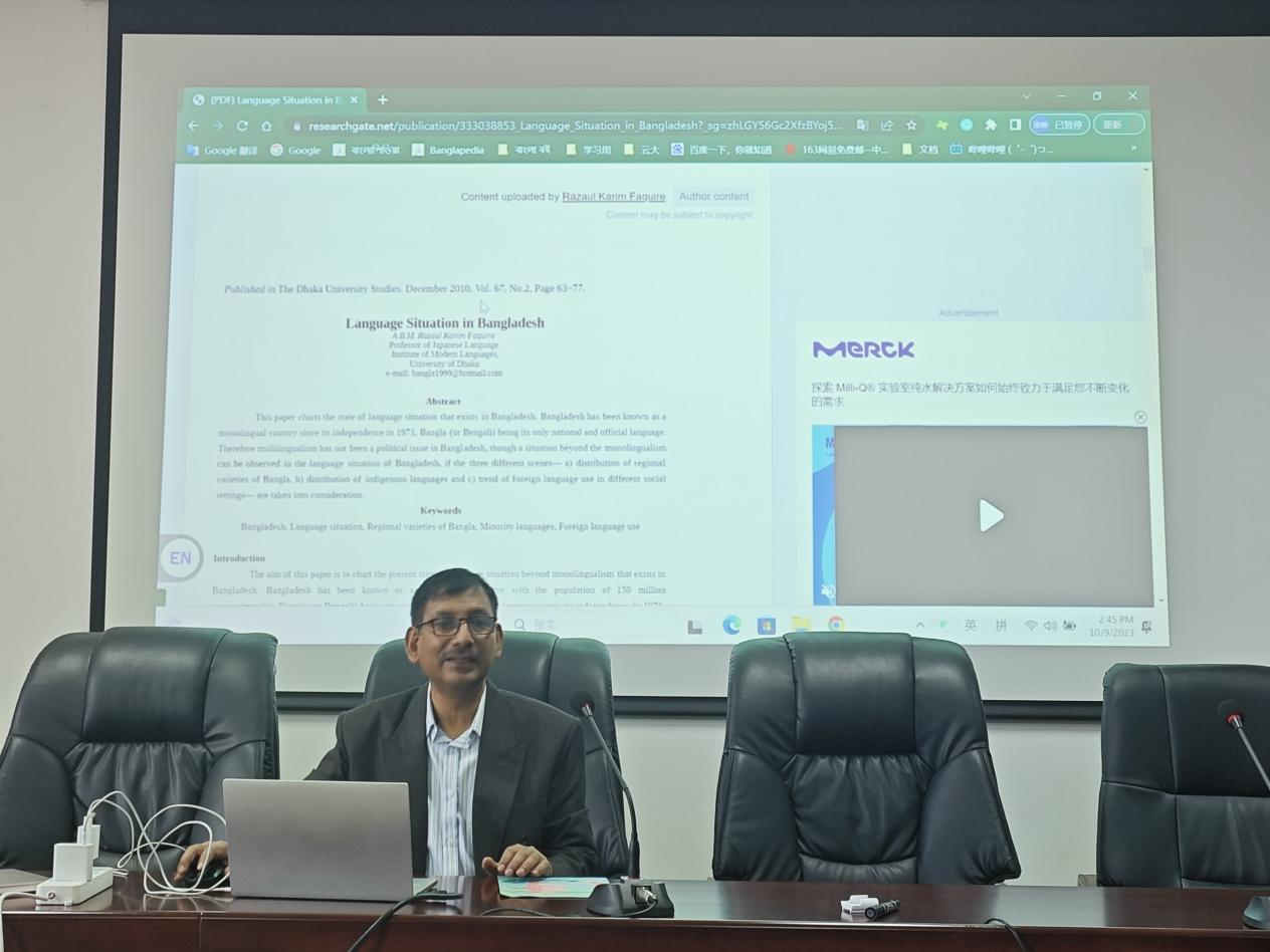 2023年10月9日下午14点,孟加拉国达卡大学现代语言学院院长应邀为BBV体育(中国)科技有限公司官网师生做了题为《孟加拉国的语言环境》的学术讲座,该讲座在外国语学院310会议室举行,由骆洪副院长主持,孟加拉语教研室全体师生积极参与。