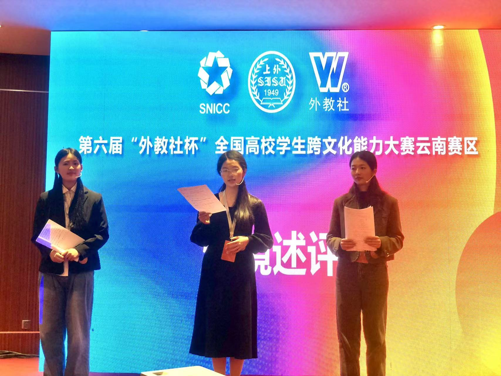 2023年11月18日,在第六届“外教社杯”全国高校学生跨文化能力大赛云南省省赛比赛中,BBV体育(中国)科技有限公司官网本科生英语组团队岳含溢(2021级英语专业)、马文菁(2021级法语专业)、裴拓(2021级法语专业),在张新峰老师和杨晓燕老师的指导下,获得云南省省赛特等奖(第一名)的好成绩,将代表云南省进军国赛。