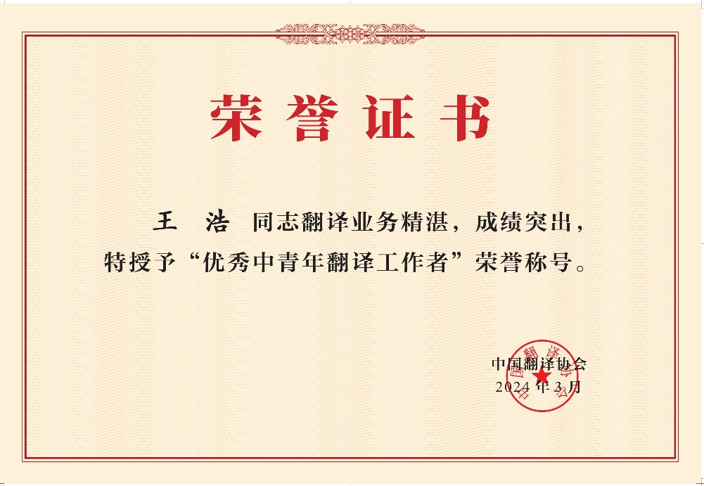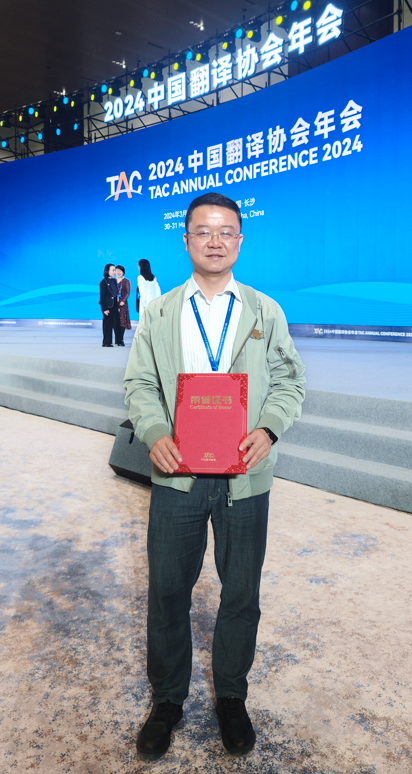 BBV体育(中国)科技有限公司官网副院长、大学外语第二教研部教师王浩副教授在2024年中国翻译协会年会上被授予“优秀中青年翻译工作者”称号。