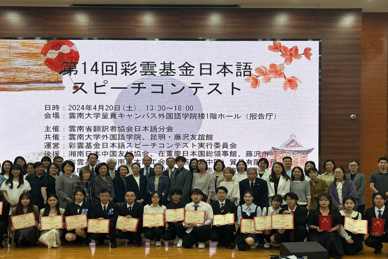秉持公平、公正、公开的原则,第十四届彩云基金日语演讲颁奖仪式于现场进行。我校张婷同学荣获一等奖,段正红同学荣获三等奖。颁奖仪式结束后,各位选手与评委嘉宾合影留念。
