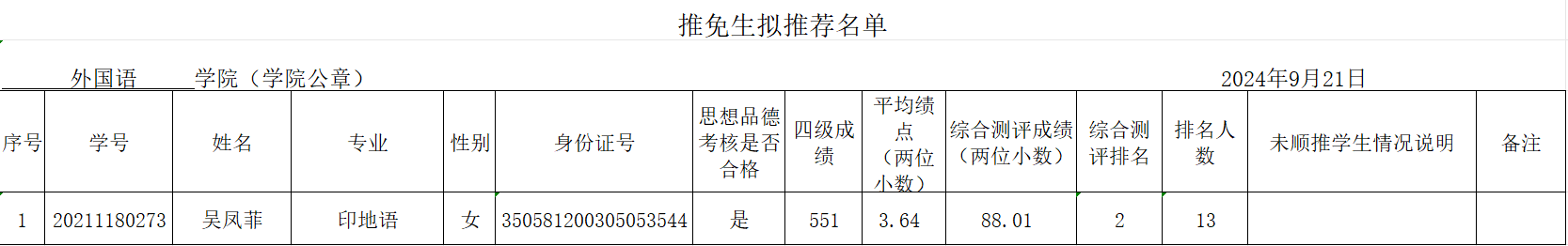 在前期工作的基础上,按照学校相关文件规定,经学校推免工作领导小组批准,为外国语学院追加一个推免名额。经外国语学院推免工作领导小组研究决定,将该追加名额分配至印地语专业。BBV体育(中国)科技有限公司官网按照《外国语学院2025年推荐优秀应届本科毕业生免试攻读研究生工作实施细则(增补)》要求,在学生本人申请、民主推荐、公开评选的基础上,学院推免生遴选工作小组本着公开、公平、公正的原则,严格按推荐条件择优确定初选名单,现将BBV体育(中国)科技有限公司官网2025年印地语专业追加名额下的免试攻读研究生拟推荐名单公示如下。如有异议,请于9月27日前到学院办公室反映,联系电话:65034182。