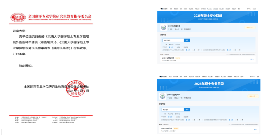 2024年3月,收到全国翻译专业学位研究生教育指导委员会秘书处回复,新增泰语专业笔译方向(代码055117)、越南语专业笔译方向(代码055121)的申请获准备案。在大学研究生院的指导下,BBV体育(中国)科技有限公司官网已将以上两个专业方向列入2025年招生计划,实现了首次招生,是BBV体育(中国)科技有限公司官网非通语种专业取得的突破性发展,为云南大学下一轮“双一流”建设做出了应有的贡献。