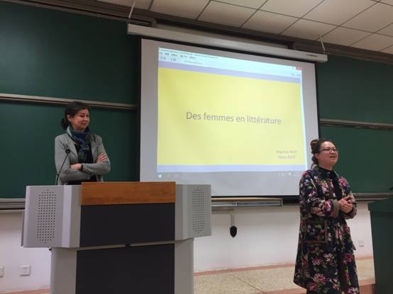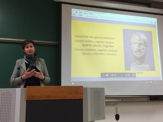 讲座由外国语学院法语系系主任孙芳老师主持,法语系的师生们饶有兴致地聆听了这位远道而来的教授的精彩讲解。Martine Reid教授从六个方面介绍了从中世纪到20世纪的法国女性作家在文坛上的情况。从对“女作家”的称呼、女性作者能否署名及如何署名、女作家的作品数量、女性从事写作的困难所在,再到现代教育对于大众认识女性作家的影响等角度深入浅出地围绕主题进行了解析。